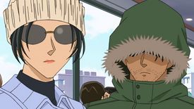 Fortunately for them, a car came with two people in it, a woman with sunglasses and a hat, and a man with a coat covering half of his face with his unshaved hair. They were invited by the woman without telling the man who was asleep. The woman, who was telling them to go in, said a strange line about the back being packed. Afterwards, Haibara notices that there are holes matching bullet holes and a recently cleaned car but with blood stains between the seats. As they just got in Tokyo, they met a traffic. They continue to chat and seemingly, they are interested in Conan and went to the Mouri Detective Agency. As Agasa was about to say something about their relationship between Kogoro, Haibara stops him from doing so, and acts as though she suddenly felt sleepy and tired. The woman suggested them to sleep while they are in a car because it will take them time.