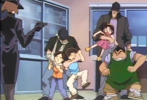 Conan and the detective boys start following the man in black. The portrait on ¥1000 bills is Natsume Sōseki, so Conan explains that the man's counterfeit may have to do with Toshiya's brother's disappearance. In a fit of oblivious deductive monologue, Conan starts talking about the men in black shrinking his body in front of the detective boys. Conan cuts himself off quickly and says it was a joke, but Haibara took notice anyway. Conan decides to plant a tracker on the man in black. Conan tells the man he dropped a ¥1000 bill which he snatches from Conan without realizing a button transmitter was stuck to the bill. To keep them from danger, Conan ditches the detective boys by telling them he has something to do and they should look for Toshiya's brother tomorrow. Ai watches as Conan runs away...