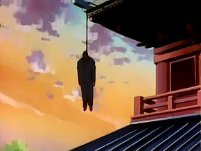 Kogoro, Ran, and Conan win a sightseeing trip in Izu mountains, Shizuoka Prefecture, after Conan solved puzzles for a contest that Ran submitted. While there, Kogoro starts to smoke and is interrupted by Juukichi Okabe, the sexton of Genkai Temple. Ran impresses Okabe with her appreciative comments and is invited, along with Kogoro and Conan, to see the temple. Okabe tells them the legend of the pagoda during the Edo period, where those who have been bad or have evil souls are mysteriously punished by being found hanging from the top of the pagoda. The tour is interrupted by the angry chief priest, Tan Kai, who Okabe explains is upset because the ODA Company had deceived him into stealing his pagoda to tear it down and build an amusement park in its place. In the evening, Kogoro, Ran, and Conan are invited by Hideaki Oda to dinner since they are staying at Hotel Oda and because of Kogoro's famous reputation. Yousuke Kajimura is there as well, and introduces himself before he is made to leave for Tokyo for business. Shun Kai, Tan Kai's son training at Sōhonzan, visits Oda during their dinner and tells Oda he won't give up getting the pagoda back for his father. The next morning, Okabe wakes everyone up and takes them to the temple again, where Oda is found hanging from the roof as the legend foretold.
