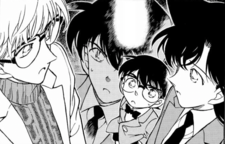 After school, the Detective Boys leisurely stroll through town on their way home. The group splits at an intersection and Conan and Haibara walk down a separate road. Conan infers Haibara's state-of-mind—assuming her discontent is about performing as an elementary schooler while risking the lives of innocent children via association. He calms her but the girl remains hopeless, truly aware of the enemy's immense scale and might. Suddenly, Haibara stops dead in her tracks as she stares petrified at a black Porsche 356 A parked on the side of the road. She explains that Gin owns this car. After an initial shock, Conan immediately calls Professor Agasa on the Earring Cellphone and directs him to bring a set of pliers and a wire hanger to his location.