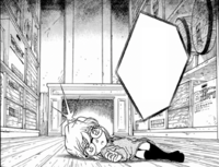 With the final piece of the puzzle revealed, Conan checks the purple handkerchief and notices a small burn mark in the center of the cloth. He smirks before picking up the chandelier fragment and he declares he has cracked the case. Sherry reaches the top of the chimney and climbs onto the snowy hotel roof. Agasa informs her that Conan has rushed into the hotel after a brief phone call with Megure. He advises her to wait on the roof until they arrive to extract her. Sherry has a moment of relief. However, it is shorted-lived as a bullet pierces her right shoulder, causing her to weakly slide against the wall. She turns to see Gin pointing his smoking gun at her with a malicious grin on his face. Gin explains that he knew she was hiding in the fireplace after finding a strand of her hair by the ashes and hearing her faint breathing. He waited for her to complete her ascent as he deemed the white snowscape as a more fitting scene for her death. Sherry sarcastically expresses gratitude. Before Gin proceeds with his execution, he demands to know what means she used to escape the Organization's gas chamber.