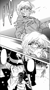 Haibara, having changed her mind, joins Conan at the Haido City Hotel. The two enter a large banquet attended by countless suspicious-looking individuals wearing dark clothing. Surrounded by danger, Haibara begins to hyperventilate. She tells Conan about the continuation of her dream the previous night, saying that Gin had executed the Detective Boys one after another just for associating with her. As her panic and self-doubt hit a crescendo, Conan places his glasses on her face, saying that its the ultimate disguise worn by Clark Kent himself. She feels slightly at ease.