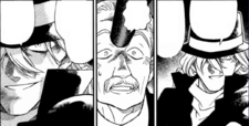 Pisco notices Conan's altered voice emanating from a box. He impulsively shoots at it only to find the Button Speaker inside. The boy suddenly appears behind Pisco with no disguise, proclaiming he is a detective while blocking the passage to Haibara. Conan asks the dumbfounded agent how he obtained a second purple handkerchief before he was interrogated—citing that it was the primary reason why the police could not label him as the culprit and had to release the suspects. Pisco refuses to answer and prepares to shoot both kids. Conan points to the dozens of broken spirit bottles leaking highly flammable alcohol onto the cellar floor. By the time Pisco realizes, his cigarette had already sparked a rapidly expanding inferno. His adversary distracted, Conan takes the opportunity to lift an unconscious Haibara and move her to safety. Pisco suspects his targets have sought shelter in the fireplace and moves to investigate. A gun emerges from the darkness followed swiftly by Gin. He points his gun at Pisco's head and informs him that a newspaper cameraman has captured a photo depicting Masuyama ostensibly raising a gun towards the chandelier—incriminating him and endangering the Organization. Pisco pleads for his life, citing his crucial knowledge about Sherry's whereabouts and his long commitment to serving the Organization. Gin states his orders to eliminate him are from the Boss themself. He then pulls the trigger on a shaken Pisco, executing him and letting the raging fire consume the evidence.