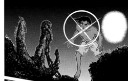 A silhouette that appears to be Kume hides amongst the trees. He finds an old boat covered by a tarp, prompting him to look inside. Then, another silhouette appears behind him, wrapping a rope around his neck.