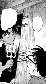 Back on the island, the group has taken refuge in the dilapidated house. Heiji shares his discovery of an anchor, stating that the anchor has been there for about four to five years based on the number of clams and vegetation on it. Ikema says that five years ago, mayor Kaneshiro's daughter was abducted, and a year later, a robbery group stole the family's prized folding screen. Based on a phone call the family received, they believe the same people committed the two crimes. Taketomi commiserates with the mayor as his wife died around the same time as the two crimes. In addition, one of his housekeepers was murdered in the robbery, and his butler resigned shortly after. To add insult to injury, a mysterious corpse wound up on an island he presided over, gouging the town's tourist numbers. Ran and Kazuha wonder if the princess from the first message was in reference to the mayor's daughter. Daito interjects that in myths, women held knives in their mouths to prevent their souls from being sucked out. He also discovers a bowl in the cupboard filled with cigarettes of various brands with its extinguishing water still present. Heiji and Conan consider the idea that multiple culprits may be hiding out on the island along with them.