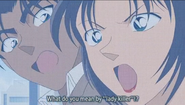 After Heiji had met Conan and discovered his true identity, he talked about him so frequently and enthusiastically to Kazuha that she became convinced that Heiji was in love with a Tokyo girl named 'Kudo.' When Heiji invited Conan, Ran and Kogoro to Osaka, Kazuha spied on them, believing Ran to be 'Kudo.' At an okonomiyaki restaurant, when Heiji got up for a moment, Kazuha sat down in his seat and warned Ran to back off him, at which point Heiji returned, the misunderstanding was cleared up, and Heiji laughed at Kazuha's behavior.[5] In their next meeting, Kazuha continued to treat Ran coldly, pointing out that Ran and Heiji's clothes had coincidentally matched the last few times they had been together. In response, Ran immediately changed clothes, after which point the girls became much friendlier.[6]